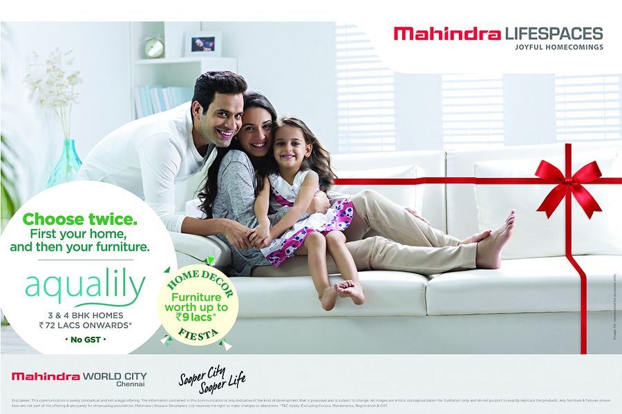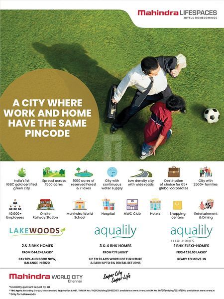 Destined in one of the prime locations with proximity to major hubs around the place. Located in Kanathur, Chennai a locality which has a combination of luxury, perfect, planned homes one of that may become your dreams.a premium gated community located within Mahindra World City in GST, Chennai offering a great combination of modern design and natural beauty. Set amidst 55 acres of greenery, the project overlooks a perennial lake and features 3, 3.5 BHK Apartment and 4 BHK Duplex for sale in Kanathur Chennai that redefines style. Encompassing exclusive Villas, Aqualily is a luxury statement designed for those who are born for an opulent living. Nestled amidst lush boulevard of greens, this residential haven flaunts a resort-like environment that effectively eases off the day's tiredness. The residences at Aqualily overlook an aesthetic lake and immaculate gardens.Aqualily Mahindra world city a Residential luxury apartment in Chennai is developed by Mahindra Life space Developers Limited in Mahindra City, GST, Chennai with all the luxurious things at one place under one roof which is a combination of natural beauty and stylish design. the interiors are smartly developed to provide large living space in all flats. The project is located very close to the center of Chennai city and easily connected to other areas by road, rail and through public and Private transports.It offers all modern amenities for a luxurious and comfortable life like landscaped gardens/park, a Clubhouse with swimming pool, spa and outdoor dining, a gym, a children’s play area, outdoor courts for sports, indoor games, and amphitheater. The project provides power back up, rainwater harvesting, sewage treatment plant and car parking. With an option to choose from three different design alternatives namely Premiere Villas, Deluxe Villas and Twin Homes, the magnanimous complex is intricately crafted to ensure a premium lifestyle.
