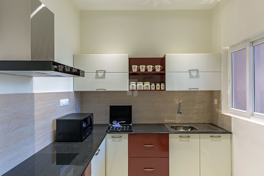 Kitchen will be provided with a 2’ wide cooking platform top of 20 mm G20 polished Black Granite with half round nosing and shall be a maximum of 10 ft length. // Single bowl stainless steel sink with drain board (1 mm thick) (36” x 18”) of PRINCE / Equivalent make shall be provided. Aquaguard provision will be given. Kitchen will not be provided with a door.