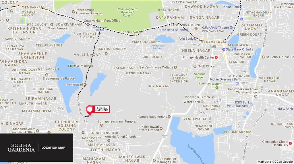 The project is about 4.5 km away from Medavakkam junction and 2 km away from Santhoshpuram junction / Nanmangalam Reserve Forest, Sobha Gardenia has clean green environs, wherein one can enjoy a quality lifestyle in the midst of nature. Nevertheless, it is so close to the city that one can enjoy great connectivity without any compromise.